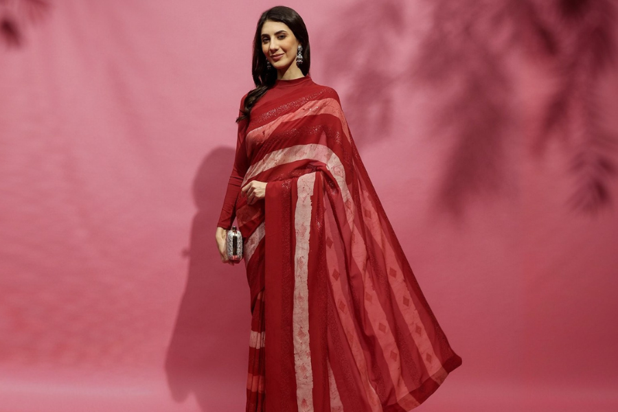 chromatic reverie reinvents the office-to-festival transition. its red liva silk excel printed saree draws inspiration from monochrome art, translating grayscale accents into subtle prints on a fiery red base. this versatile printed saree works as a polished workwear piece and a spirited puja drape, making it simple to shop sarees online for multi-occasion wardrobes. cinch the waist with a sleek belt and slip on metallic juttis to merge corporate chic with festive fervor.