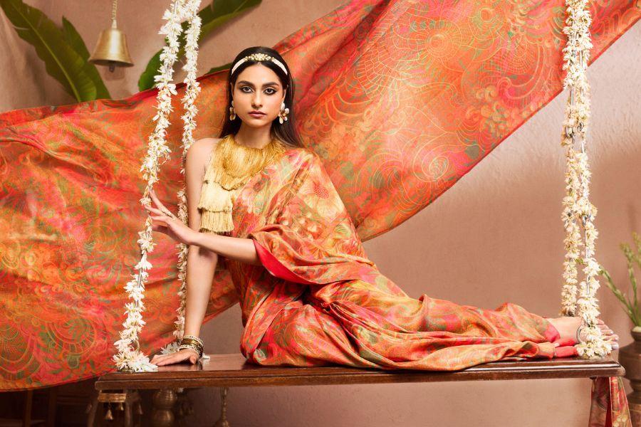 liva fabrics sit between luxury and comfort. they drape like a dream, breathe on humid days and often come in satin or crepe finishes that catch light beautifully. for a haldi function saree, these qualities matter: you want something that lays flat for candid photos, won’t cling after a little turmeric, and still feels special. yellow in liva feels fresh on camera, and prints or foil accents hide tiny spills better than plain whites or pastels.