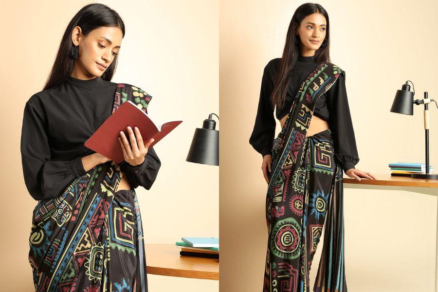 - Modernize your blouse: Swap a traditional blouse for a slim-fit turtleneck in knit or jersey fabric. This not only adds a layer but also brings a fresh, European-influenced vibe to your saree outfit.