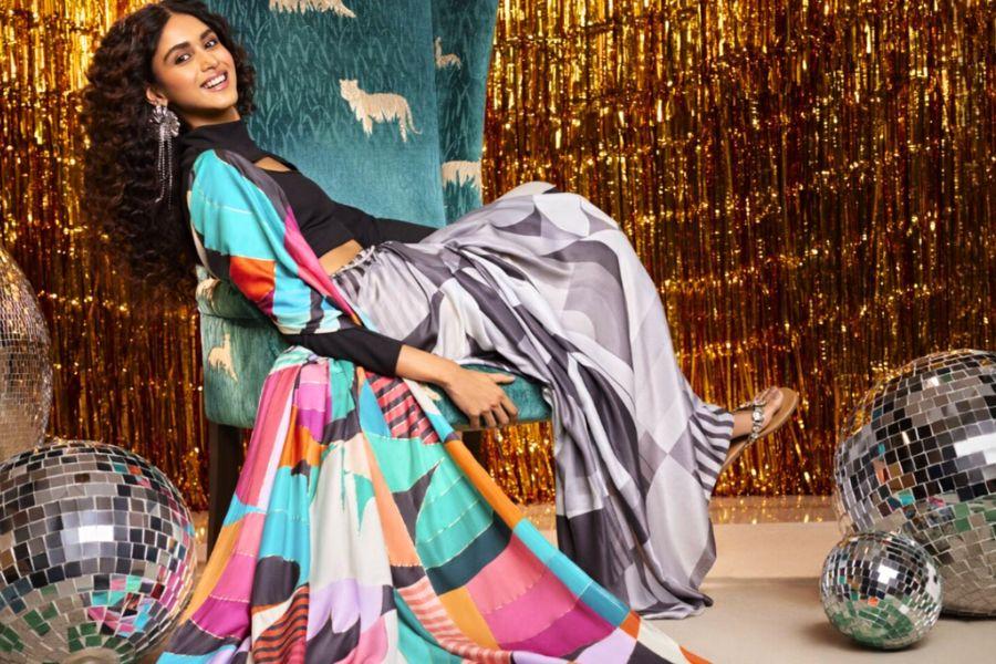 a subtle clamp-dyed print in satin gives warmth without being overt. evening aura brings soft peach tones and a delicate printed surface that suits an elegant rooftop party or a candlelit dinner. pair it with a thin layered necklace and warm, dewy makeup to let the fabric’s glow do the work.