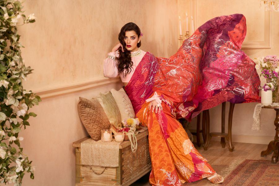 bloom riot saree is a red liva satin saree where large floral motifs meet a rich, saturated colour. it reads powerful yet feminine. because the fabric has a lustrous fall, keep accessories minimal: a pair of small hoops, a slim bracelet and a clutch. this kind of floral print satin sarees works best with a fitted blouse that offers a clean frame.